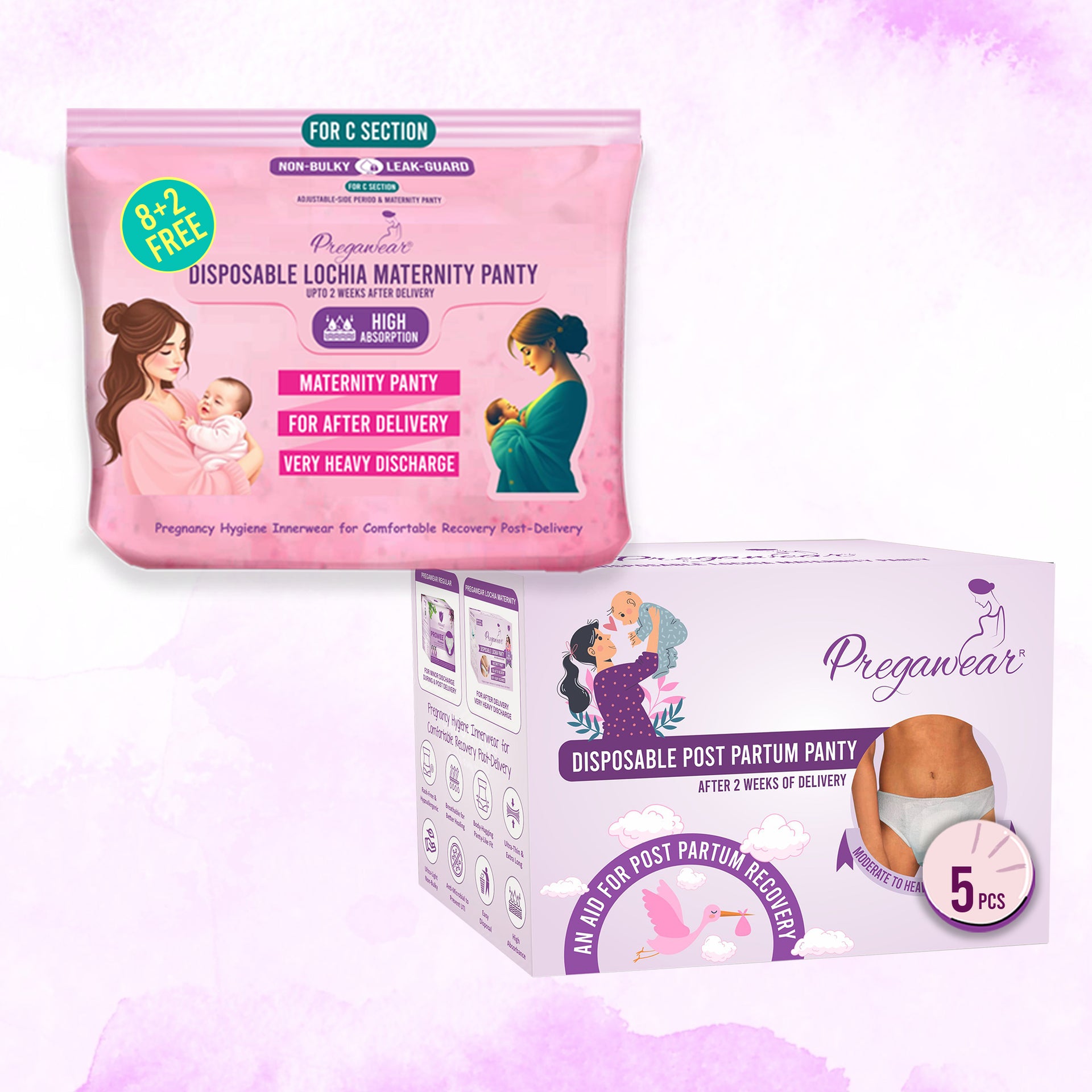 Pregawear Disposable Lochia Maternity Panty CS & Postpartum Maternity Panty combo pack for C Section is highly comfortable and handy solution for post C-Section delivery recovery period during which new mother experiences very heavy vaginal lochia discharge. Specially designed low-waist panty, with adjustable buttons, to avoid discomfort caused by rubbing against the incisions. For caesarean delivery- promotes better healing of stitches. The postpartum panty is extra-long and ultra thin. This discharge contains a mix of blood, mucus and uterine tissue, it can last for several weeks. Pregawear disposable Lochia panties are equipped to handle this extra heavy flow after C-Section or normal delivery, in-built leak guards which avoid spillage of discharge, super absorbent material manages and protects from the feeling of wetness. Pregawear panties are complacent and convenient for new moms. The material is soft and button-style around the waist that prevents itching, pain, and discomfort against the incisions. The breathable material of Pregawear Panty has antibacterial and antifungal properties. With a fair range of sizes of panties, one gets to choose as per one's need. Adequate air circulation around the groin area results in better healing of incisions. Ideal and appropriate for new moms to celebrate the joys of motherhood.
