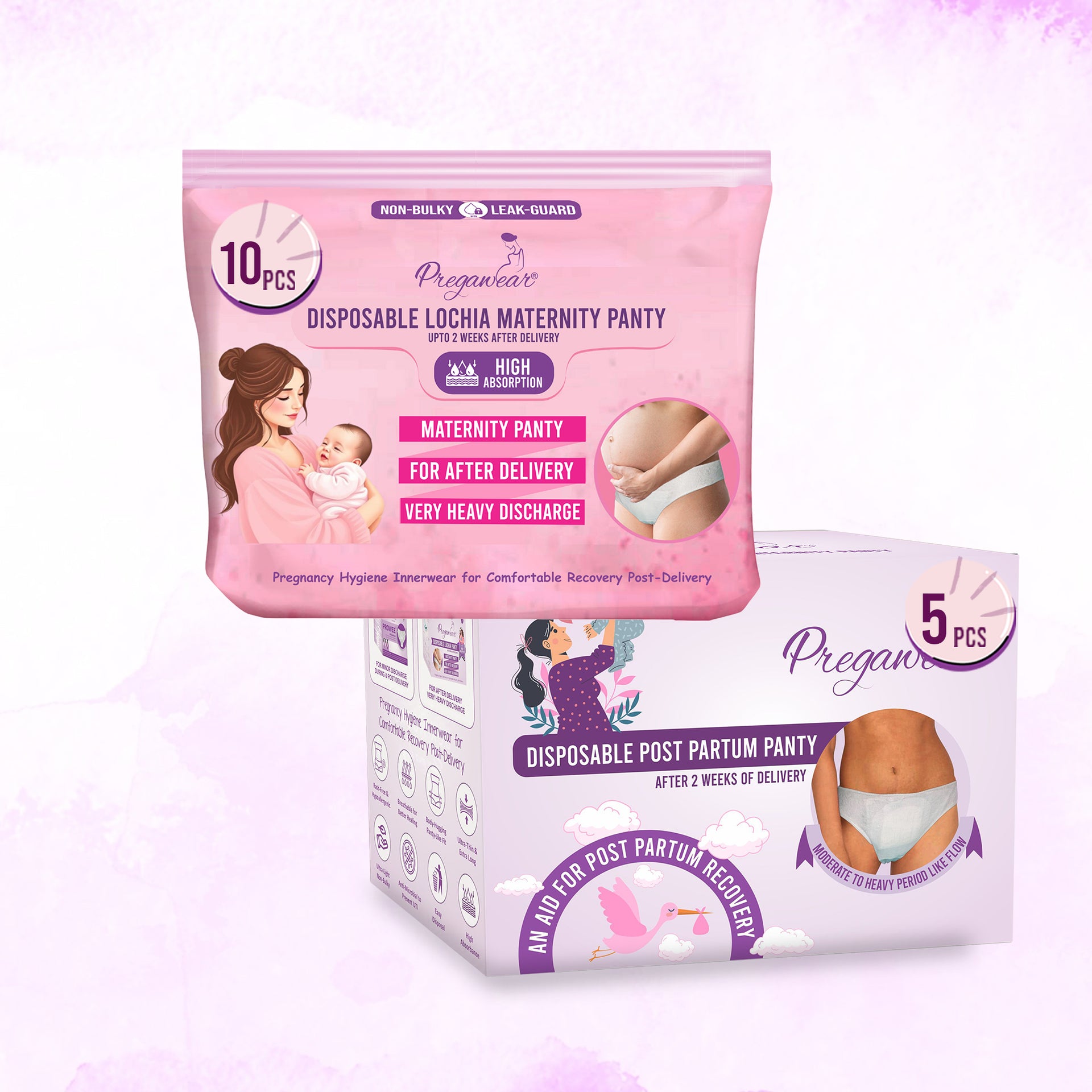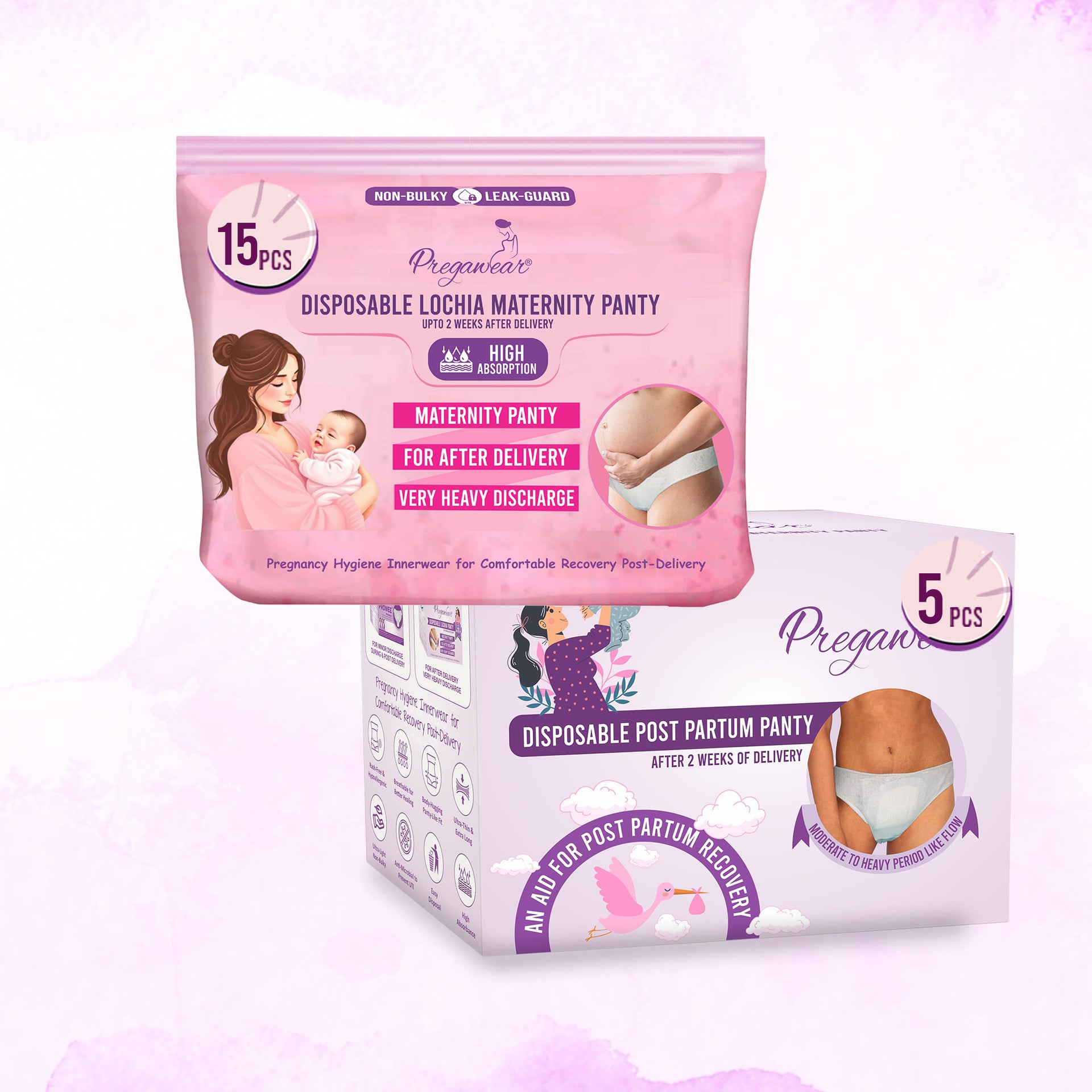 The Pregawear Lochia Maternity Panty & Postpartum Panty Combo is specially designed to support new mothers during the challenging weeks after childbirth. Whether you have just delivered your baby and are experiencing heavy lochia discharge or transitioning to lighter postpartum flow, this combo offers complete hygiene, comfort, and protection.The Pregawear Lochia Panty is built for the early postpartum phase when bleeding and discharge are at their heaviest. With a built-in leak guard and super absorbent material, it prevents spillage and locks in wetness, keeping you dry and comfortable. The Postpartum Panty is perfect for later recovery, when discharge reduces. It is soft, stretchable, and breathable, ensuring maximum comfort while still protecting you from leaks and maintaining hygiene. Both panties are made with antifungal and antibacterial fabric that minimizes the risk of infections, itching, and odor. The skin-friendly, lightweight, and disposable design makes them hygienic, convenient, and stress-free for every new mother.