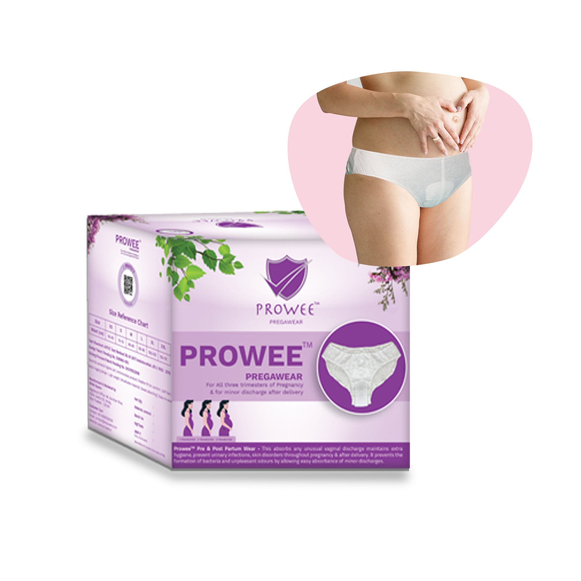 Prowee™ has a specially curated range of disposable panties for all stages of pregnancy and also for the postpartum period. Prowee™ Peripartum Panties are part of the Pregawear (Pregnancy Wear) range, These are comforting products for the mothers or to-be-mothers. Panties under this range are crafted to aid women to manage all kinds of vaginal flows. Pregawear Peripartum disposable panty has been designed for managing minor flows during the Peripartum period.