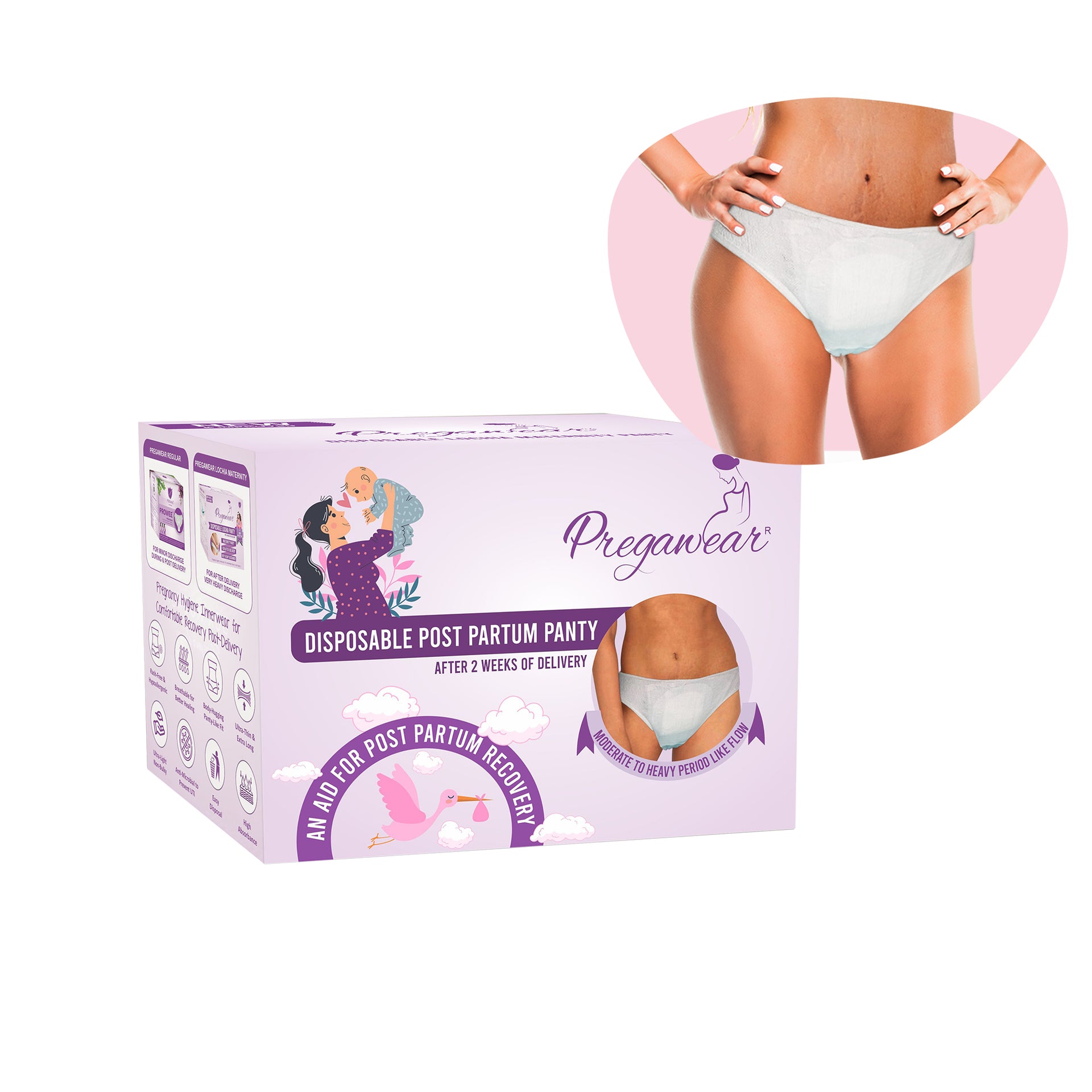 Post Partum Maternity Panties (Disposable) with High Absorption Pads for After Lochia Heavy Flow.Pregawear--Disposable Post Partum Panty